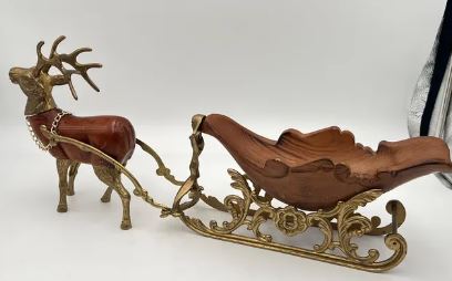 Decor XMas Seasonal Vintage 21x4x10H BrnGld Teak & Brass Deer & Sleigh