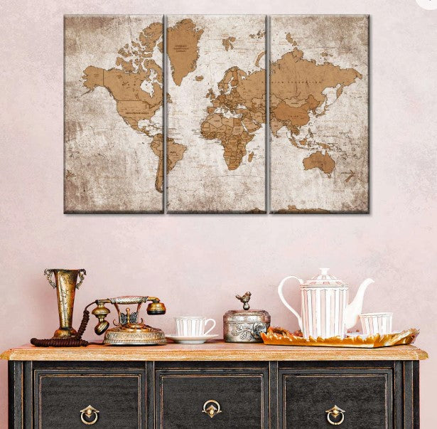 Wall Decor 3 Panel World Map Canvas 38x24H TnBrn