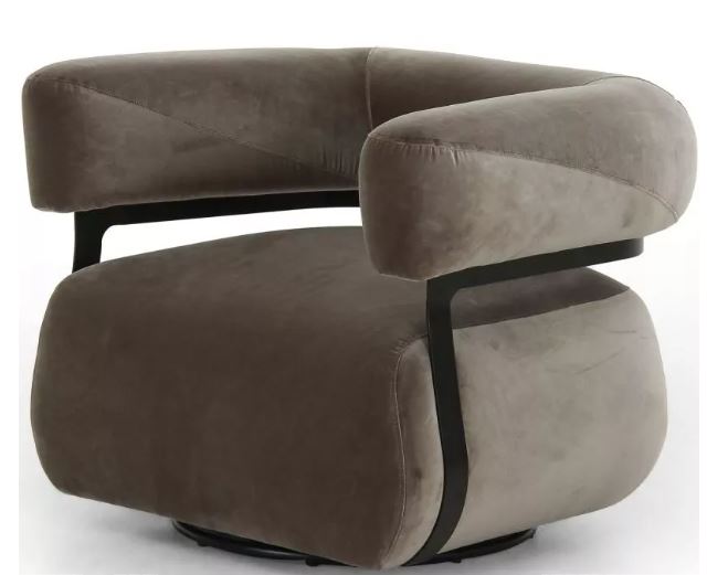 Eighties inspiration brought to modern speed. With a 360-degree swivel and black iron frame, an inflated silhouette speaks to the Brazilian influence behind this curvy seating style upholstered in a velvety blend.
