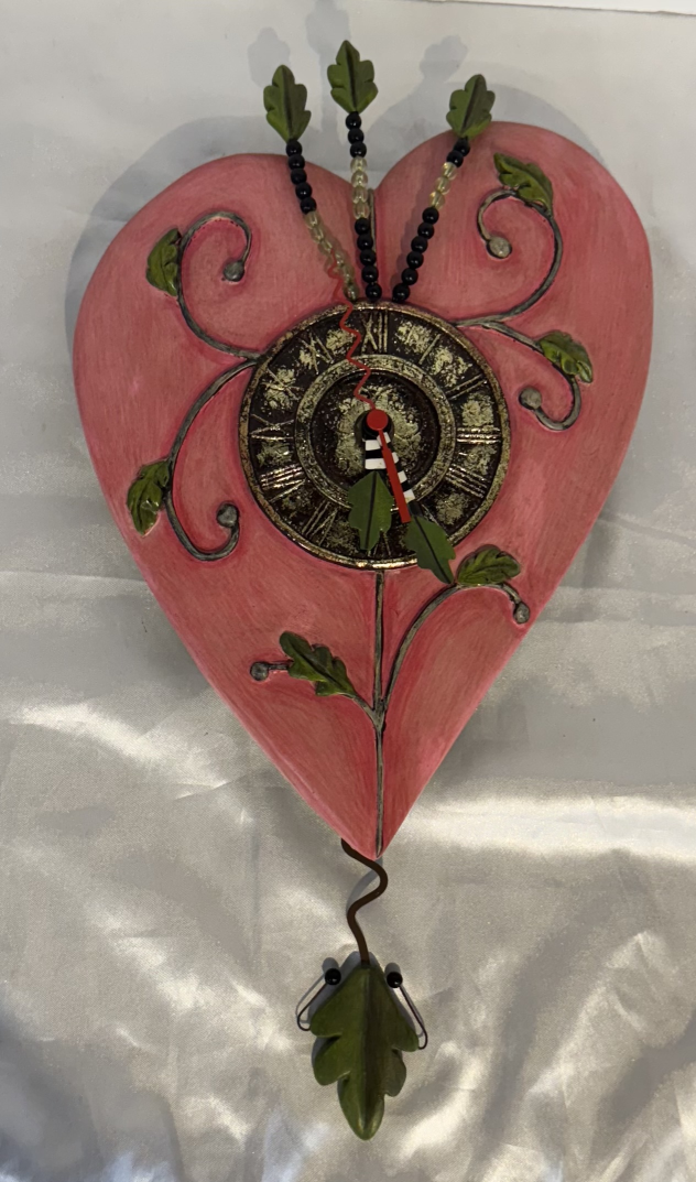 Decor Clock 8x15H PGrnBlkW Resin Heart