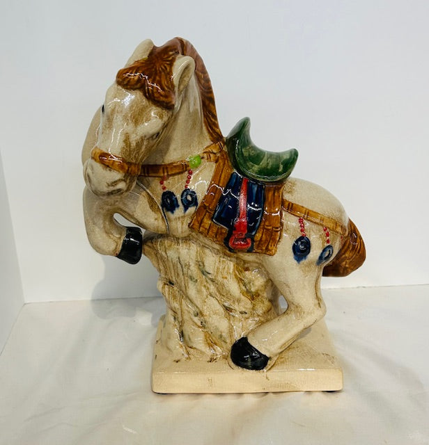 Decor Ceramic Asian War Horse 9.5x11.5H BrTnGrBu