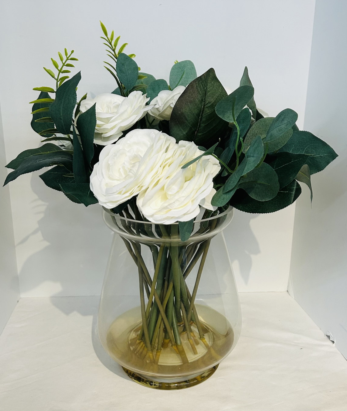 Decor Floral 15x19H GrnWhClr Faux Greens & Glass Roses